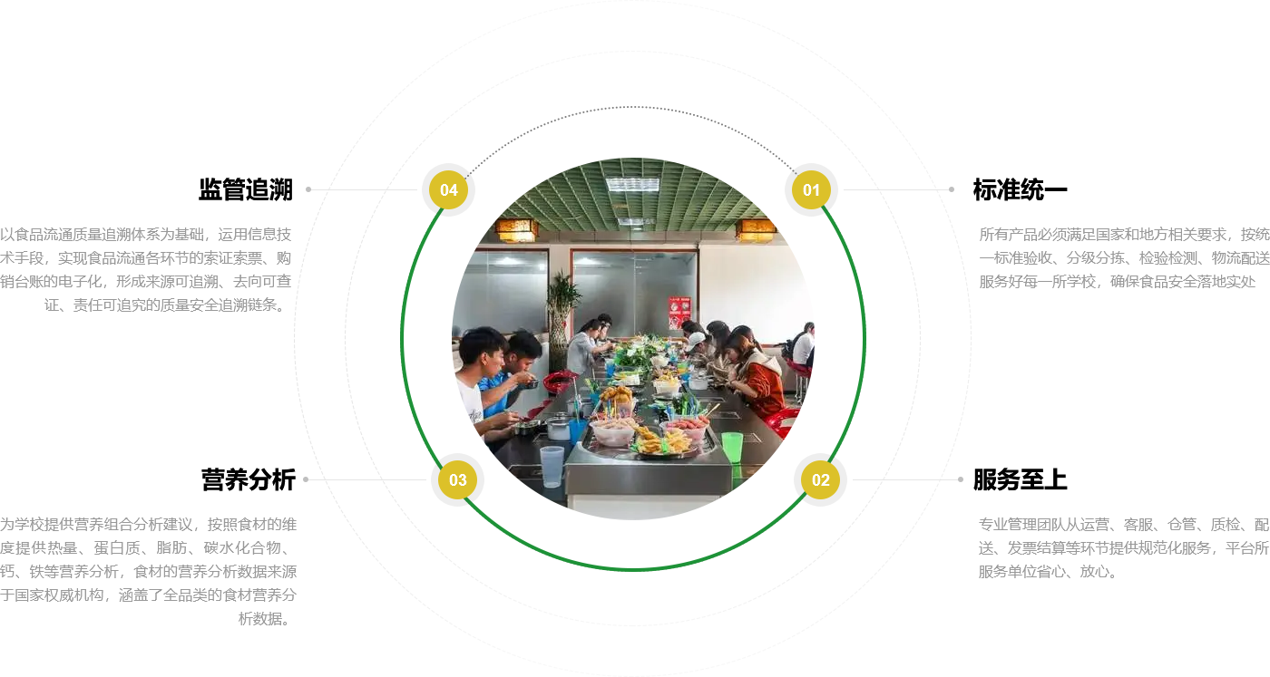 爱游戏Ayx校园营养餐聚焦中小学,着眼公共食堂食品安全,依托标准的运营与严格的管理,以数字化食安监管平台为核心,确保食材供应实现全溯源、全检测, 保障食品安全,用心关爱学生每一餐。